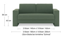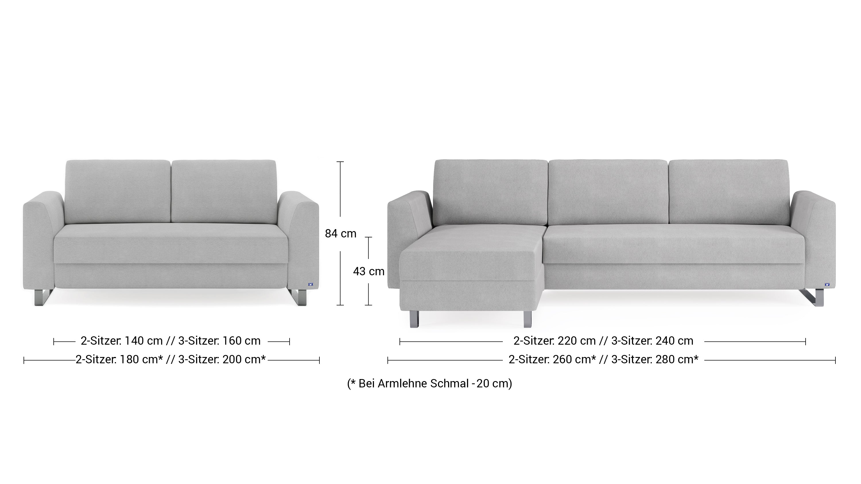 Sie können zwischen den Armlehnen Schmal, Klassik und Kubus wählen. Bei der Variante Klassik gibt es zusätzlich die Auswahl zwischen Holz- und Metallfüßen. Die Holz- und Metallfüße haben eine Höhe von 10cm.