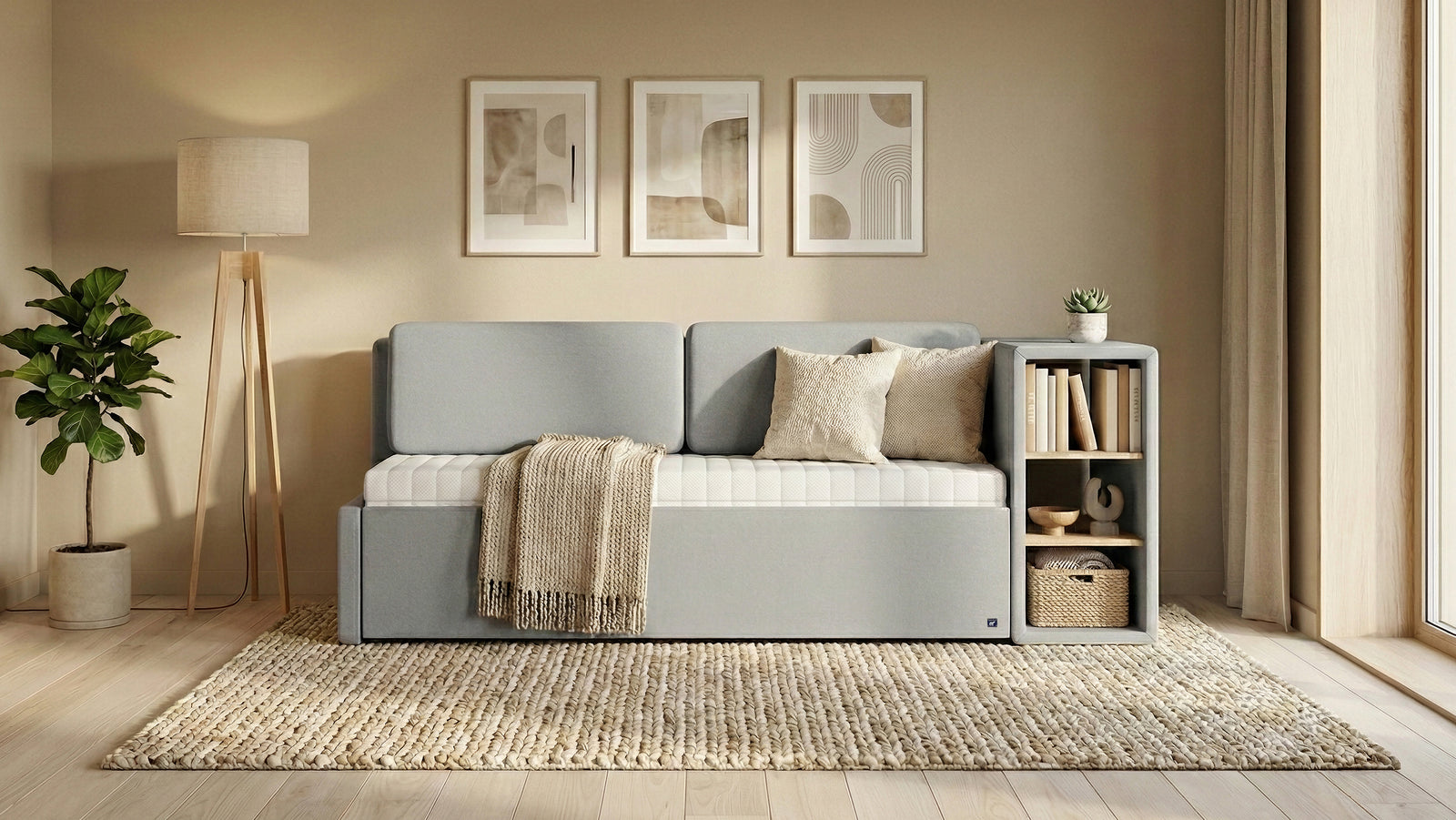 Unser multifunktionaler Alleskönner: Sofa, Einzelbett mit Stauraum oder Doppelbett