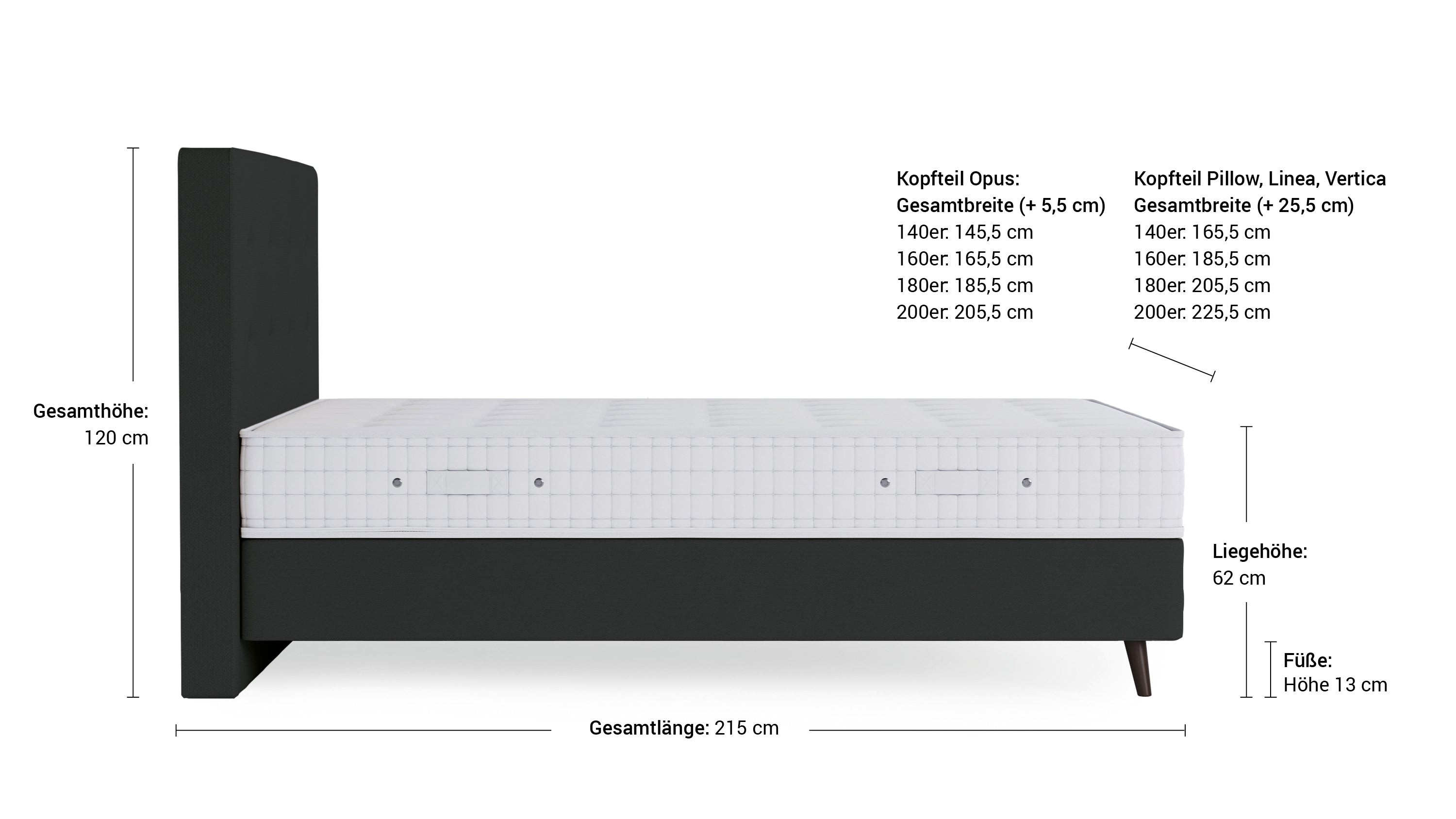 Höchster Komfort, feinste Materialien und zeitloses Design: Das Bruno Boxspringbett Prestige steht für luxuriösen Schlafkomfort auf höchstem Niveau. Mit einer Einstiegshöhe von 62 cm und einer 27 cm hohen 7-Zonen-Luxusmatratze aus Pulse-Latex und hochelastischen Taschenfedern bietet es perfekte Druckentlastung, optimale Unterstützung und ein außergewöhnlich weiches Liegegefühl. Durch die hohe Schicht aus Pulse-Latex entsteht eine angenehm weiche und gleichzeitig druckentlastende Liegefläche, sodass kein zusätzlicher Topper notwendig ist.