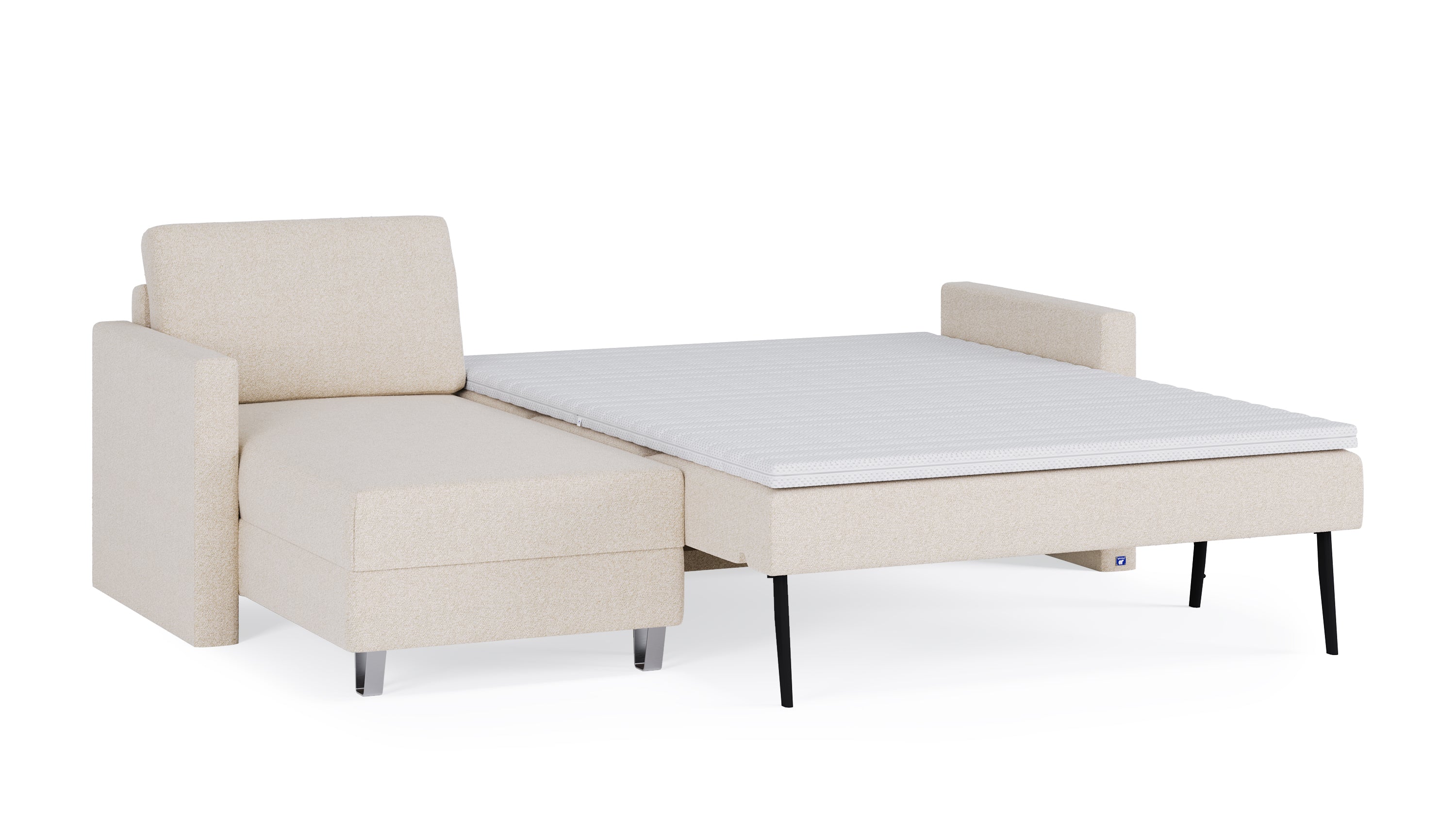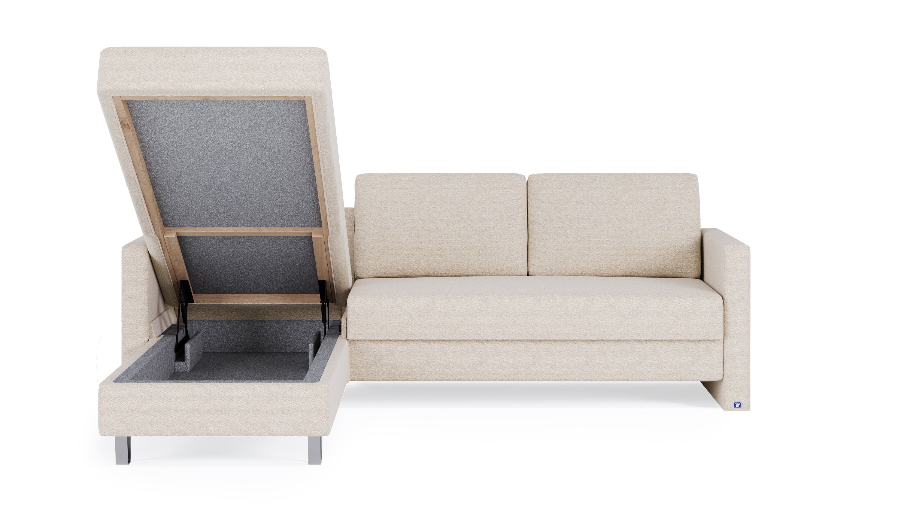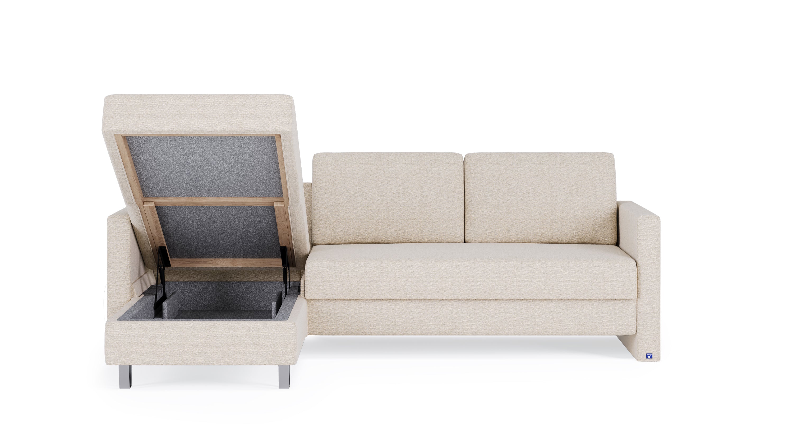 Für alle, die eine gemütliche und praktische Ergänzung zum Schlafsofa oder -sessel suchen, ist der Bruno Hocker die richtige Wahl: Er dient als gemütliche Ablage für Füße, Bücher oder ein Tablett, bietet extra Stauraum und lässt sich schnell und einfach umstellen.